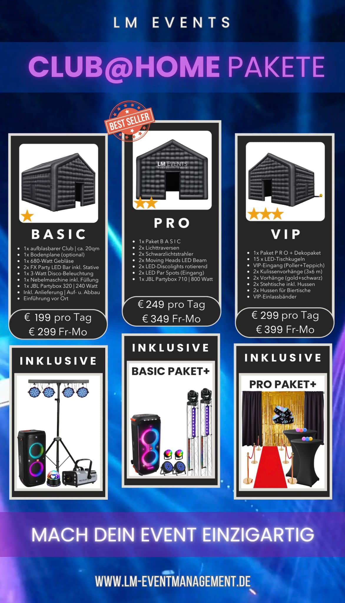Unsere Event-Pakete enthalten alles, was du für eine beeindruckende Veranstaltung brauchst: aufblasbare Club-Zelte, hochwertige Licht- und Soundtechnik, stimmungsvolle Dekoration und auf Wunsch exklusive VIP-Setups. Vom kompakten Party-Setup bis zur erstklassigen Premium-Lösung – wir bieten dir maßgeschneiderte Konzepte für jede Eventgröße.